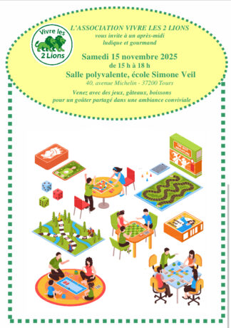 Vivre les 2 Lions vous propose un après-midi ludique et gourmand samedi 15 novembre à la salle polyvalente de l’école Simone Veil.