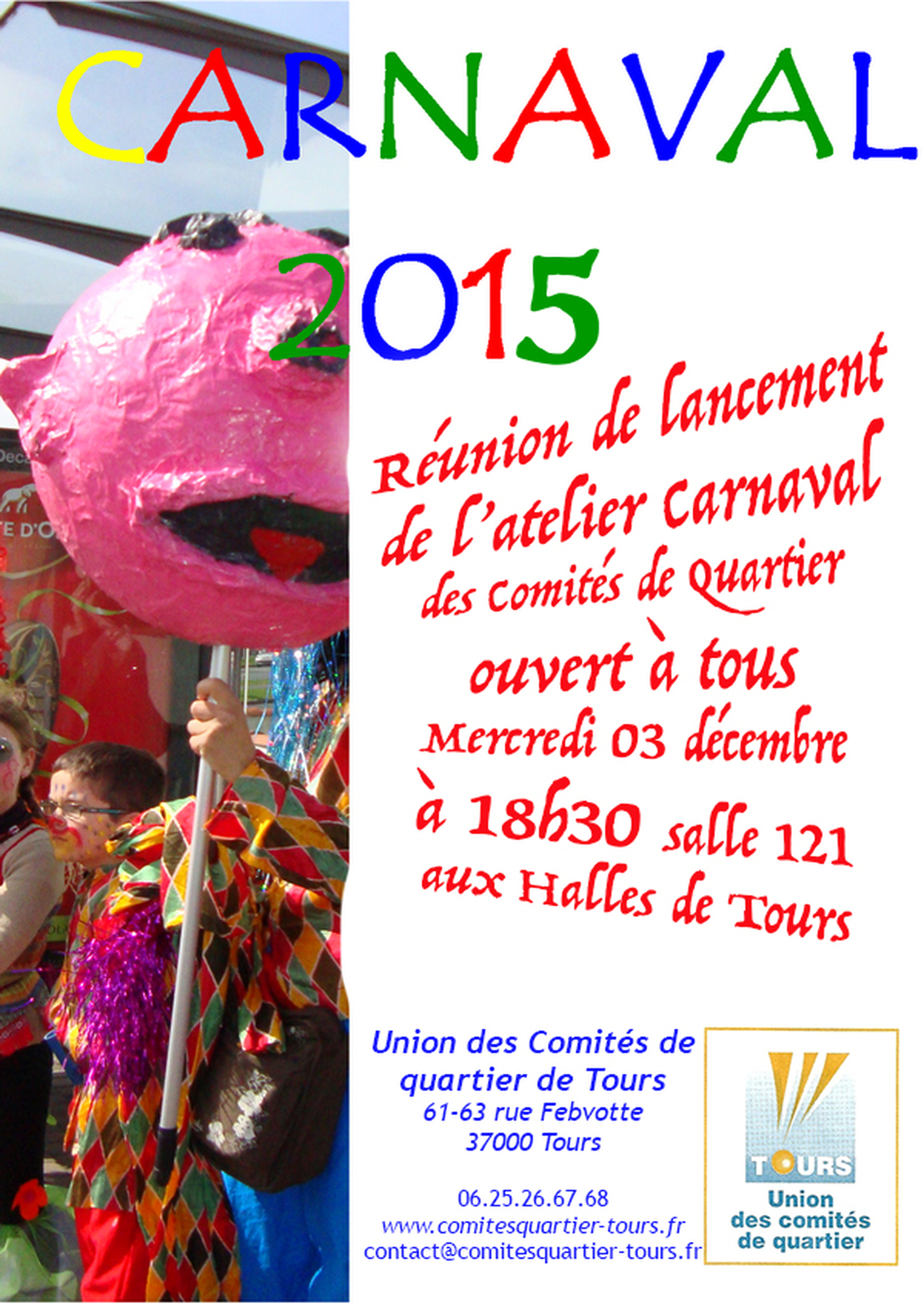 Le 03 décembre prochain l’Union des Comités de Quartier de Tours organise une réunion de lancement d’un atelier en vue de la participation des comités de quartier au carnaval de Tours qui devrait se dérouler en Avril 2015.