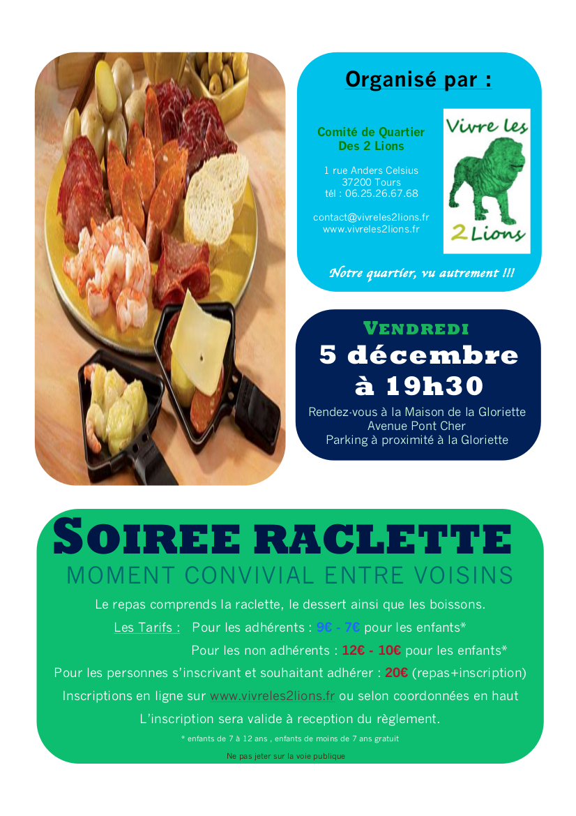 Le comité de quartier organise une soirée raclette le 05 décembre prochain. Regardez les détails de ce repas sur l’affiche jointe et s’inscrire via le formulaire ci-dessous.